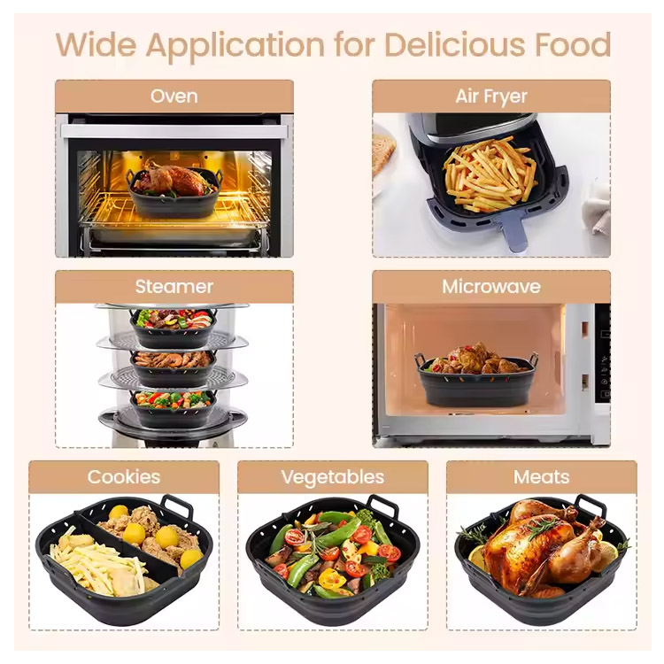 Perfecto para usar en freys de aire, hornos y microondas. Ideal para hornear, asar verduras, asar carne o cocinar comida congelada. Su diseño versátil se adapta a la mayoría de las canastas de freidora de aire cuadrado.