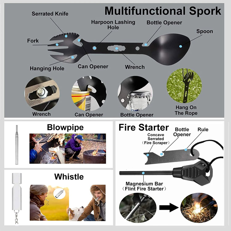 Kit de equipo de supervivencia al por mayor para acampar, caminar, pescar, cazar. Su mejor solución de supervivencia todo en uno para aventuras al aire libre. Este completo kit de equipo incluye un hacha de escape de emergencia, un silbato de señalización y un iniciador de fuego confiable. Diseñado para acampar, hacer caminatas, pescar y cazar, garantiza la máxima preparación en situaciones críticas.